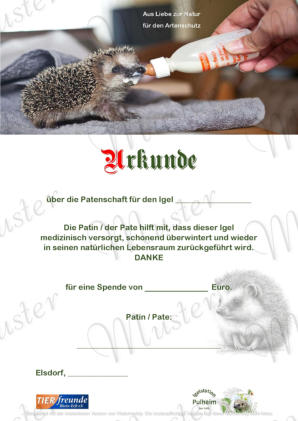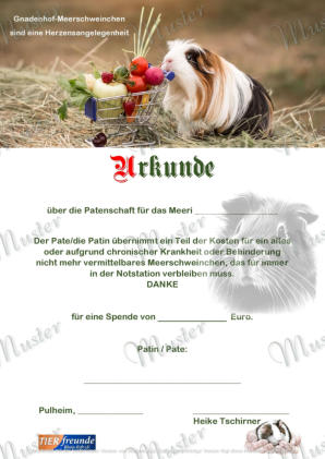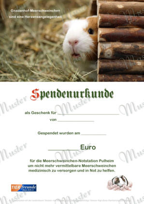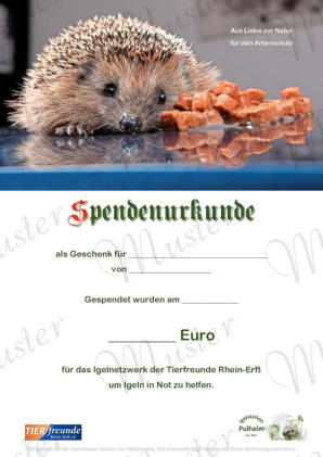 Sie sind auf der Suche nach einem passenden Geschenk? - Hier werden Sie fündig…Geschenk- oder Patenschaftsurkundefür Igelfür MeerschweinchenSo geht‘s…Kontaktieren Sie uns per E-Mail oder telefonisch. Wir informieren Sie gern.KontaktE-Mail: info@tierfreunde-rhein-erft.deMobil: 0152-540 510 84Folgende Angaben sind nötig:•Höhe der Spende (ab 20,00 €)•Darüber hinaus für die GeschenkurkundeName und Vorname des/der BeschenktenName und Vorname des Schenkers/der Schenkerin•Für die PatenurkundeName und Vorname des Paten/der Patin•Bitte überweisen Sie die Spende auf das Vereinskonto.•Sie erhalten die gewünschte Urkunde im Format DIN A4 laminiert auf dem Postweg oder digital als PDF-Datei.Spenden an eingetragene, gemeinnützige Vereine sind steuerlich abzugsfähig. Deshalb Anschrift nicht vergessen.